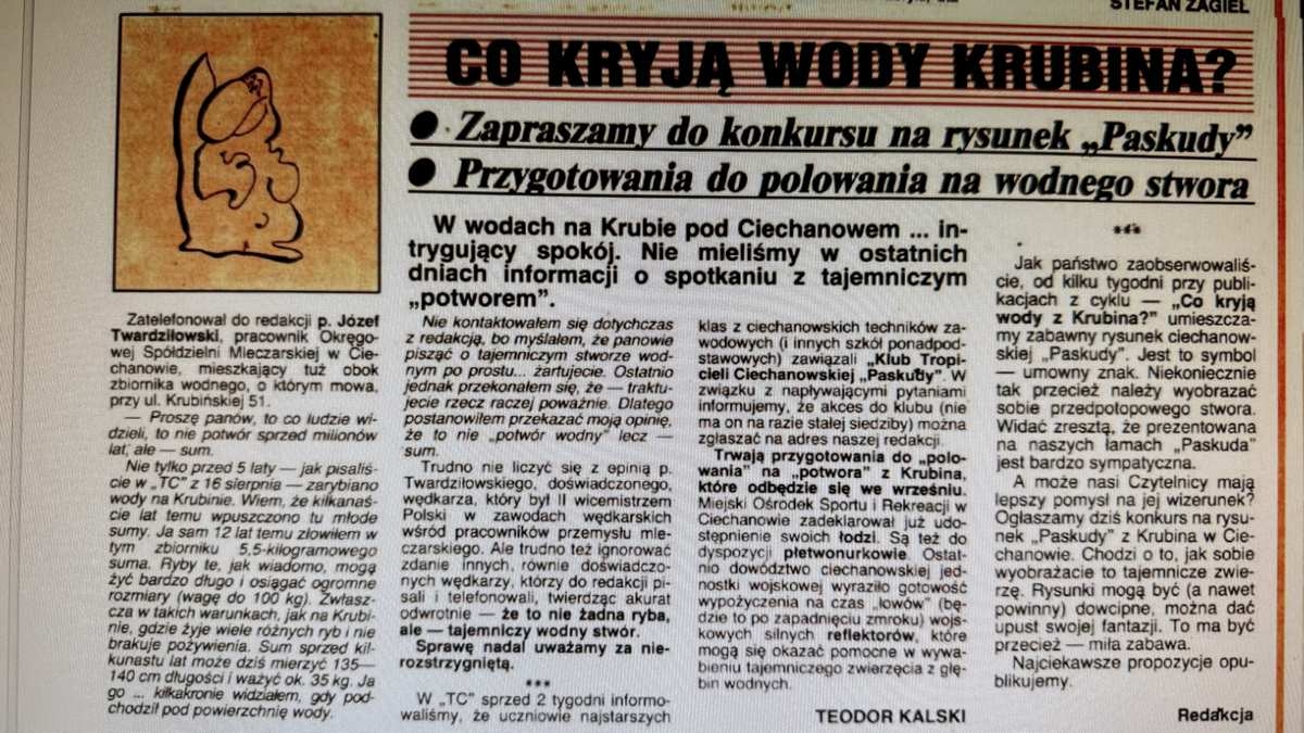 Wszystko zaczęło się latem 1991 roku. Wędkarze łowiący na Krubinie opowiedzieli redakcji „Tygodnika” o dziwnym stworzeniu, które wynurzyło się na chwilę z wody, po czym zniknęło. W kolejnych tygodniach pojawiały się następne świadectwa – mieszkańców, spacerowiczów, młodzieży wracającej ze szkoły. Redakcja powoływała ekspertów, którzy analizowali zjawisko z naukową powagą. Głos zabrał m.in. docent Jerzy Praczyniak z Instytutu Ichtiologii SGGW w Warszawie, który mówił o możliwości przetrwania „reliktowych form życia sprzed milionów lat”.