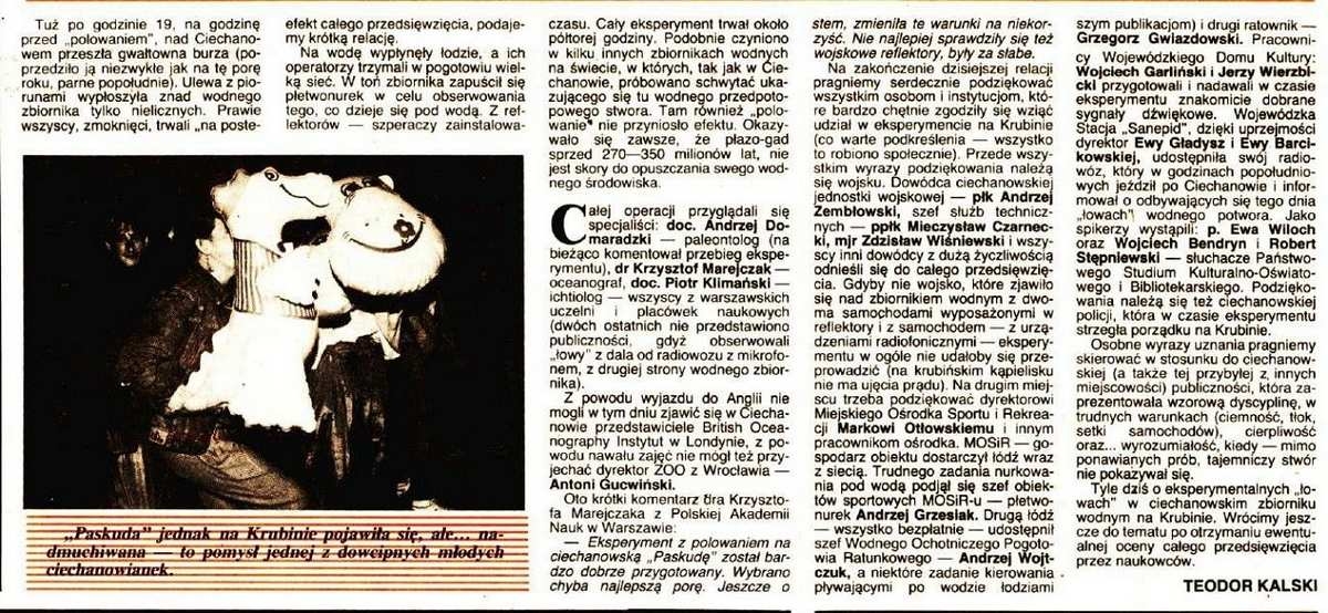 Niedługo później kierownik obiektów MOSiR-u, nurek Andrzej Grzesiak, opisał cień widziany na głębokości ośmiu metrów i ślady na dnie zalewu. Relacje czytelników mnożyły się z tygodnia na tydzień.W szkołach powstawały kluby „miłośników Paskudy”, organizowano konkursy plastyczne, a niektórzy przedsiębiorcy pytali, czy mogą nazwać bar lub sklep obok zalewu imieniem słynnego potwora. O ciechanowskim zjawisku zaczęto nawet pisać w prasie spoza regionu, a do redakcji napływały listy od naukowców z zagranicy.