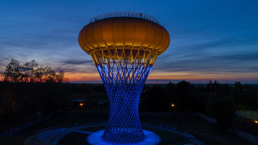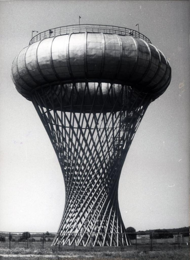 Choć wszyscy mówią na nią „wieża ciśnień”, w rzeczywistości jest to wieżowy zbiornik wyrównawczy wody. Powstał w latach 70., kiedy Ciechanów dynamicznie rozwijał swoją dzielnicę przemysłową i potrzebował stabilnego systemu zaopatrzenia w wodę. Projekt przygotowany pod kierunkiem architekta Jerzego Michała Bogusławskiego był śmiały – i jak na tamte czasy wręcz futurystyczny. Konstrukcja miała formę torusa osadzonego na hiperboloidzie obrotowej, czyli bryły znanej raczej z podręczników matematyki niż z miejskiego krajobrazu.