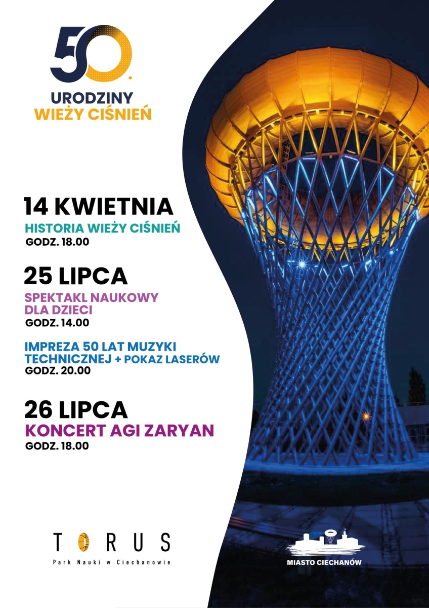 W połowie kwietnia w Torusie Michał Bogusławski - architekt (syn projektanta wieży) - wraz z Tadeuszem Pikusem, który w latach 80. XX w. był wiceprezesem ciechanowskich wodociągów oraz prezydentem Krzysztofem Kosińskim opowiedzą o historii wieży - od momentu projektowania aż po dzisiaj, gdy wieża stała się swoistym symbolem Ciechanowa. W dniach poprzedzających jubileuszowy koncert odbędą się imprezy dla mieszkańców i turystów. Dla najmłodszych zaplanowano spektakl naukowy, a następnie, już dla nieco starszych, otoczenie wieży zamieni się w scenę dźwięków, świateł i laserów inspirowanych elektroniczną muzyką w stylu Jean-Michele Jarre’a aż po współczesne techno.