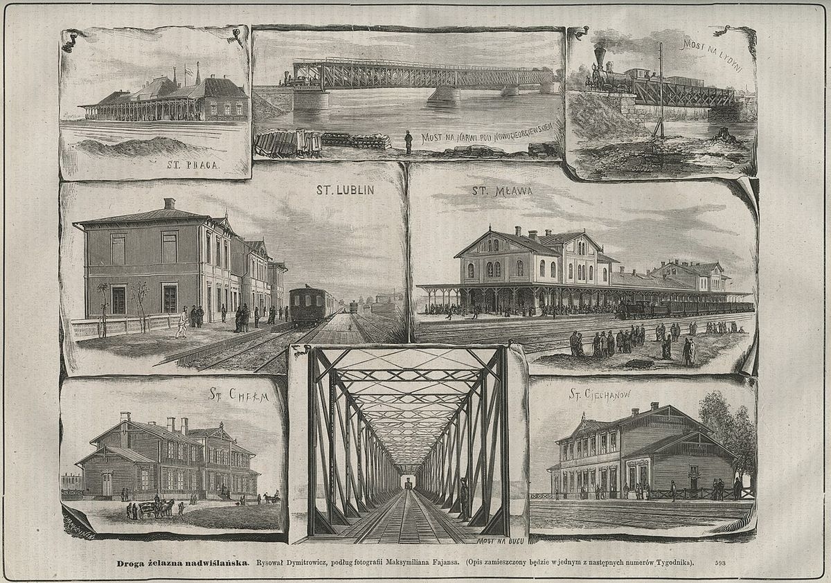 Przypomnę, bo pisałem już o tym na łamach TC, że Kolej Nadwiślańska, zwana w XIX wieku Drogą Żelazną Nadwiślańską, prowadziła od nadgranicznej Mławy, poprzez Ciechanów, Nowogieorgiewsk (Modlin), Warszawę-Pragę, Iwanogród (Dęblin), Lublin, Chełm aż do Kowla. Jak się szacuje cała linia liczyła w 540 km torów, 181 mostów i wiaduktów (z tego 76 żelaznych) oraz 27 stacji, w tym dwa murowane dworce w Lublinie i w Mławie, które były wybudowane już w chwili otwarcia kolei w 1877 r. Budynek dworcowy w Mławie miał część hotelową, restauracyjną, pocztową itd. Nocował na nim między innymi Bolesław Prus, a przez pewien czas pracował tu również Władysław Reymont. Budowa linii Kolei Nadwiślańskiej i jej późniejsza eksploatacja była jedną z najważniejszych inwestycji znanego warszawskiego potentata finansowego hrabiego Leopolda Kronenberga oraz jego synów i współudziałowców. Przynosiła ogromne zyski i dawała zatrudnienie tysiącom ludzi. Sam tabor kolejowy spółki szacowano na 36 parowozów, 700 wagonów towarowych oraz kilkanaście wagonów pocztowo-pasażerskich. Z funduszy spółki budowano domy dla pracowników kolei, szkoły, budynki użyteczności publicznej, a nawet wspierano budowę kościołów. Wytyczanie szlaków kolejowych, ich budowa i otwarcie było wyjątkowym wydarzeniem, a zarazem kołem zamachowym dla lokalnej i regionalnej gospodarki oraz początkiem procesów społeczno-ekonomicznych, które wkrótce zmieniły oblicze wielu miast, miasteczek i wsi na Mazowszu Północnym. Ale początki, tak jak obecnie, wcale nie były łatwe.
