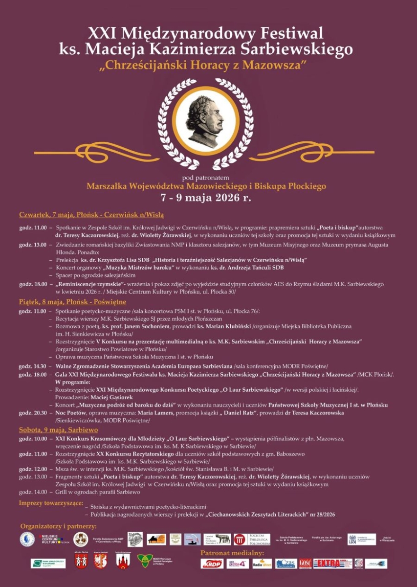 W piątkowe popołudnie odbędzie się również Walne Zgromadzenie Stowarzyszenia Academia Europaea Sarbieviana, a o godzinie 18 – w płońskim MCK rozpocznie się gala XXI Międzynarodowego Festiwalu ks. Macieja Kazimierza Sarbiewskiego „Chrześcijański Horacy z Mazowsza”.