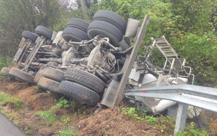 Na drodze powiatowej w pobliżu Poczernina w gm. Płońsku doszło do zdarzenia z udziałem pojazdu typu gruszka, przeznaczonym do transportu mieszanki betonowej.