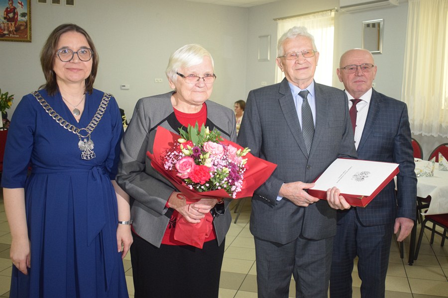 Medale za długoletnie pożycie małżeńskie, nadane przez Prezydenta RP oraz pamiątkowe statuetki i upominki wręczyli jubilatom: wójt Beata Pierścińska oraz przewodniczący rady gminy Zbigniew Nowicki.