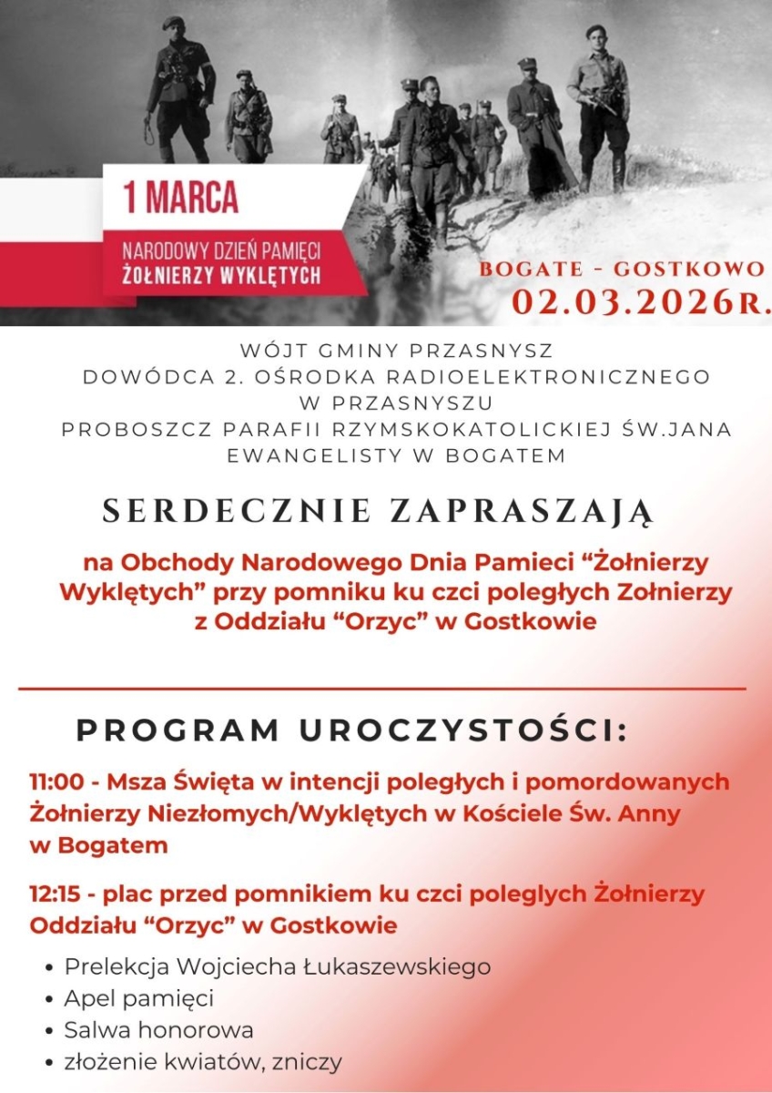 Wójt gminy Przasnysz, dowódca 2. Ośrodka Radioelektronicznego w Przasnyszu oraz proboszcz parafii pw. św. Jana Ewangelisty w Bogatem zapraszają mieszkańców do udziału w uroczystościach upamiętniających Żołnierzy Niezłomnych.
