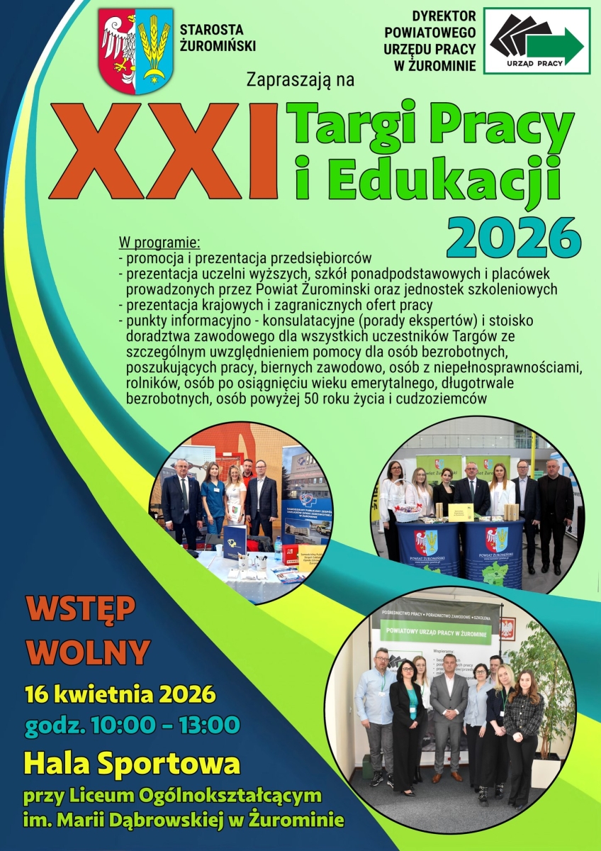 Mieszkańcy powiatu żuromińskiego będą mieli wyjątkową okazję wziąć udział w XXI Targach Pracy i Edukacji, które odbędą się w czwartek 16 kwietnia w godzinach 10:00–13:00. Wydarzenie zostanie zorganizowane w Hali Sportowej przy Liceum Ogólnokształcącym im. Marii Dąbrowskiej w Żurominie.